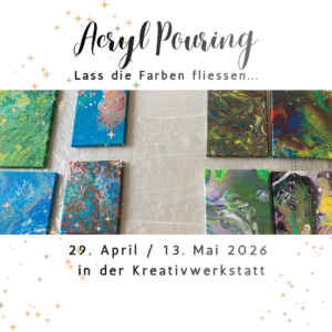 Wir lassen Farben frei ineinanderfließen, sodass dein persönliches Bild entsteht. Petra Matzenauer, seit 20 Jahren als Acryl-Künstlerin tätig, zeigt, wie man Acrylfarben miteinander vermischt und schlussendlich auf die Leinwand oder einen anderen Gegenstand fliessen lässt.